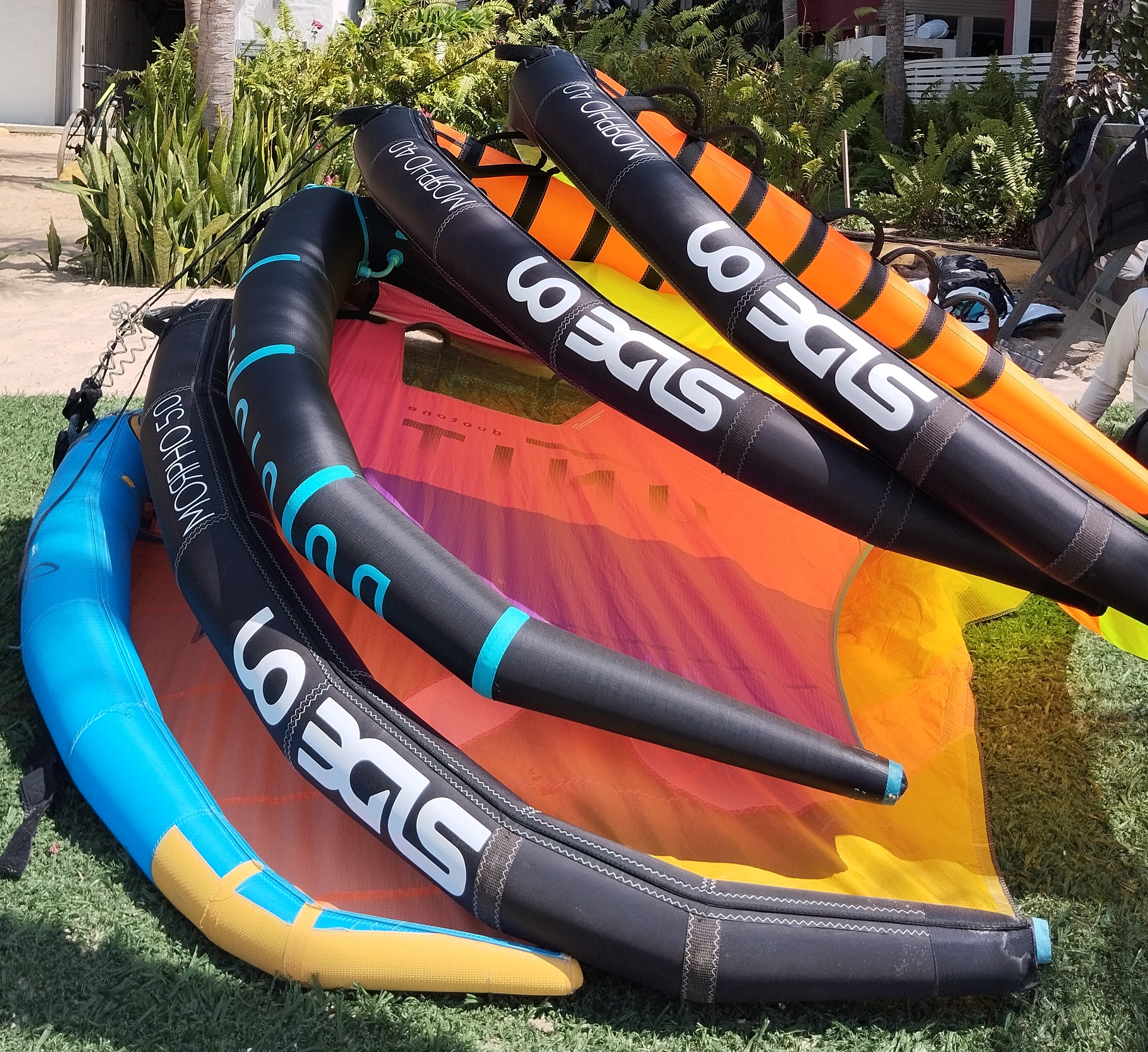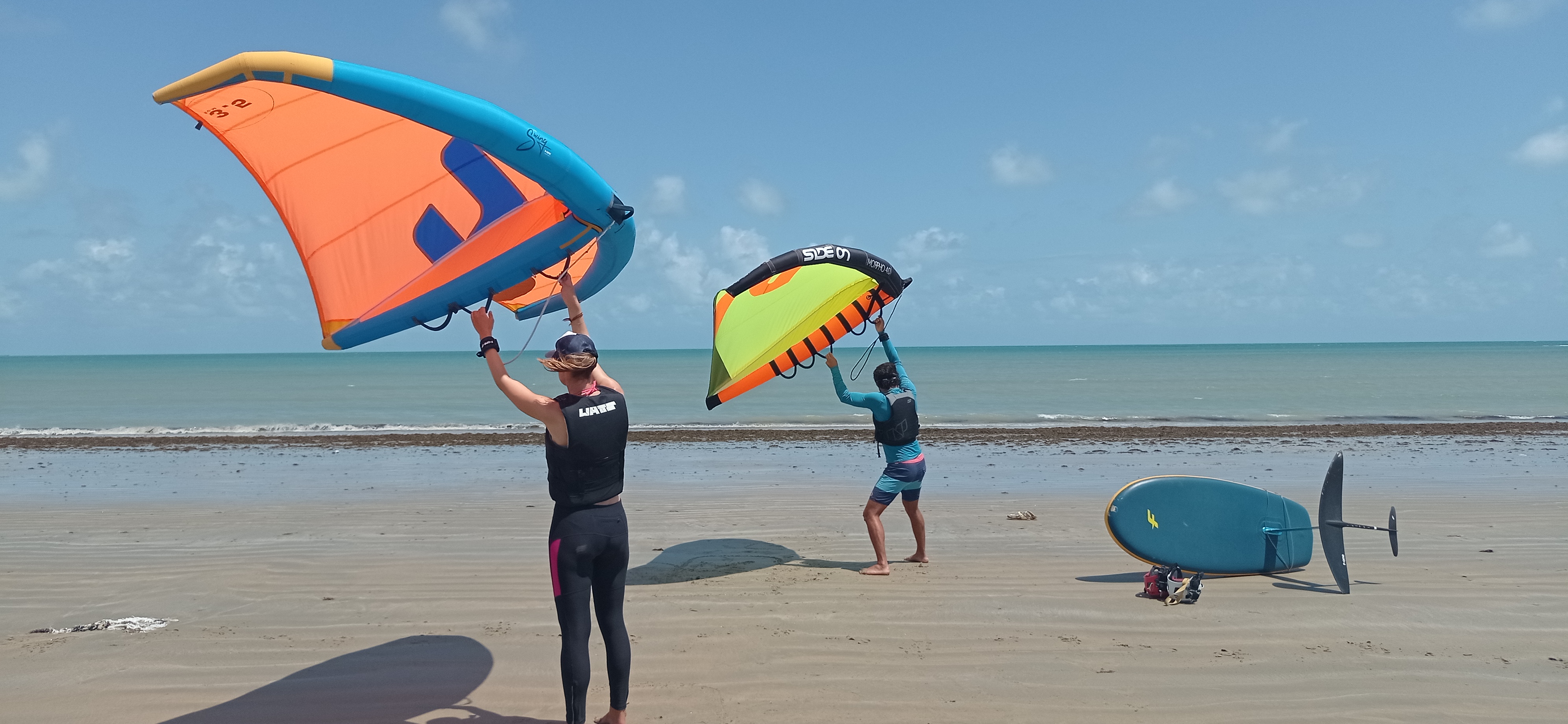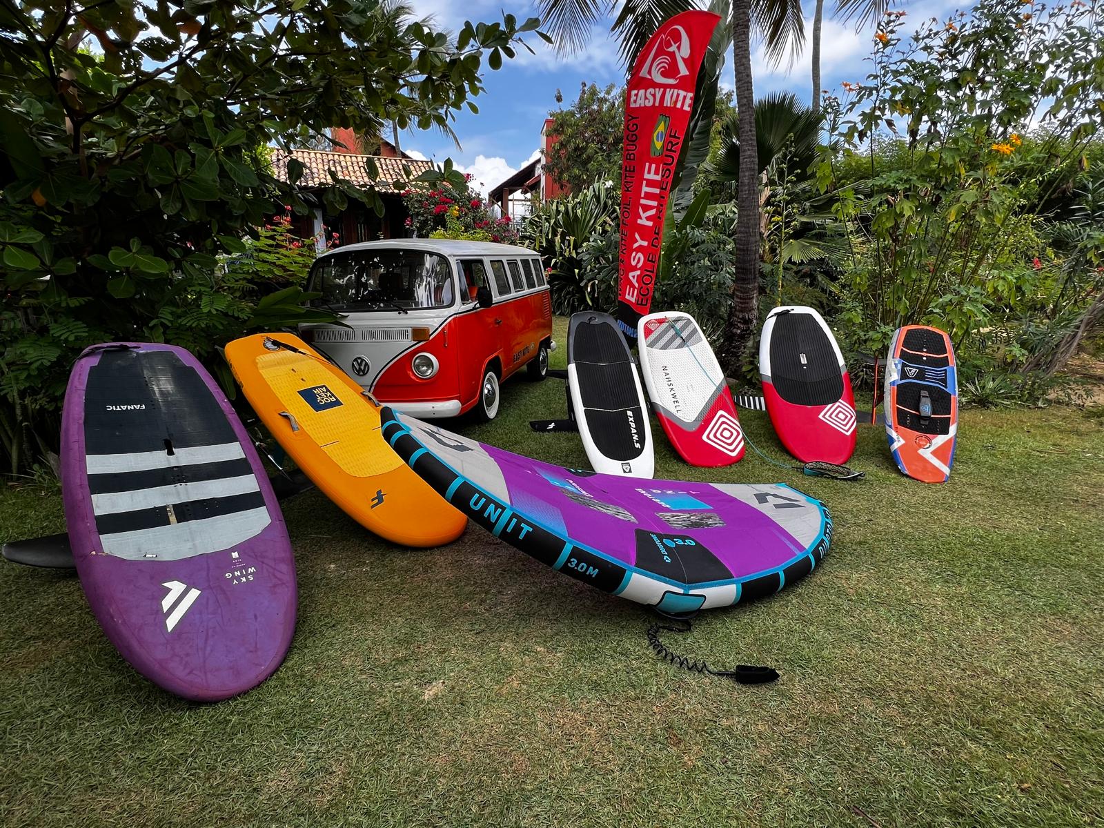 Des planches de 70 à 140 litres, rigides et gonflables, avec des mats de 60 a 85cm et des ailes de foil de 720 a 2400. Il y en a pour tous les niveaux. Venez découvrir la wing en groupes ou en famille.